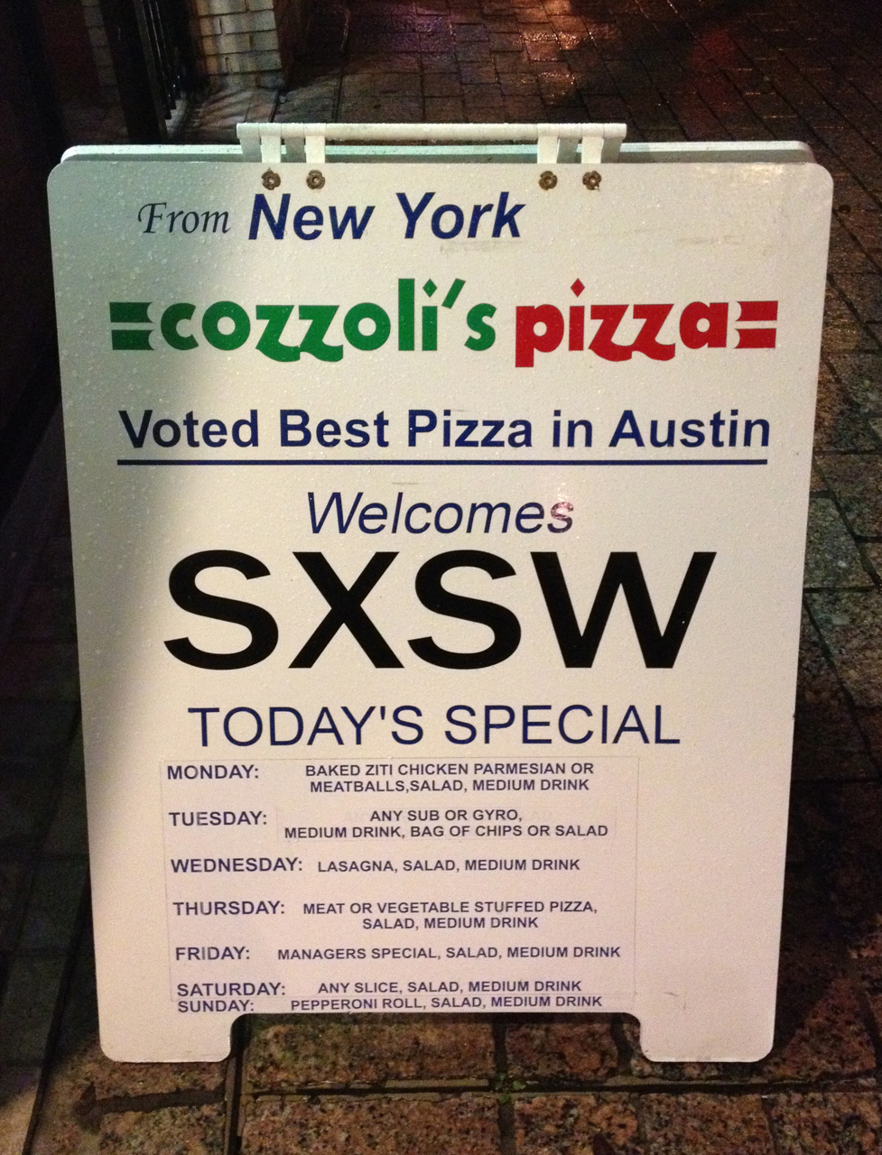 Weather has been awful. By awful I mean it has amounted to the sort of rainfall and cold you’d expect in Portland right now. Today has cleared up and I’m grateful, but yesterday some events were rained out and moved, such as And I Am Not Lying, a storytelling workshop, based in Brooklyn, NY. The awkwardness of this was the fact that it’s a burlesque show with stories and comedy that usually shows in alcohol fused venues and was supposed to be in an outdoor park with free beer, but ended up in a Hilton conference room with no booze. Was it hard to watch? Only a little, after all, these are very good performers and funny people. My ADD caught up with me, so I left, missing about forty-five minutes, attempting to catch more SXSW stuff. I obtained my free drink – they really know how to treat press – in the Registrant’s Lounge, got a nice girl’s phone number, and instead of seeing something different, I went back to my friend Kat’s place and made dinner, talked about death, racism, and police detainment with her and Maggie, another Austin comedian.