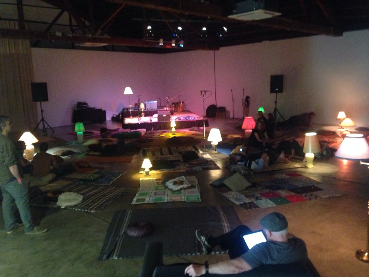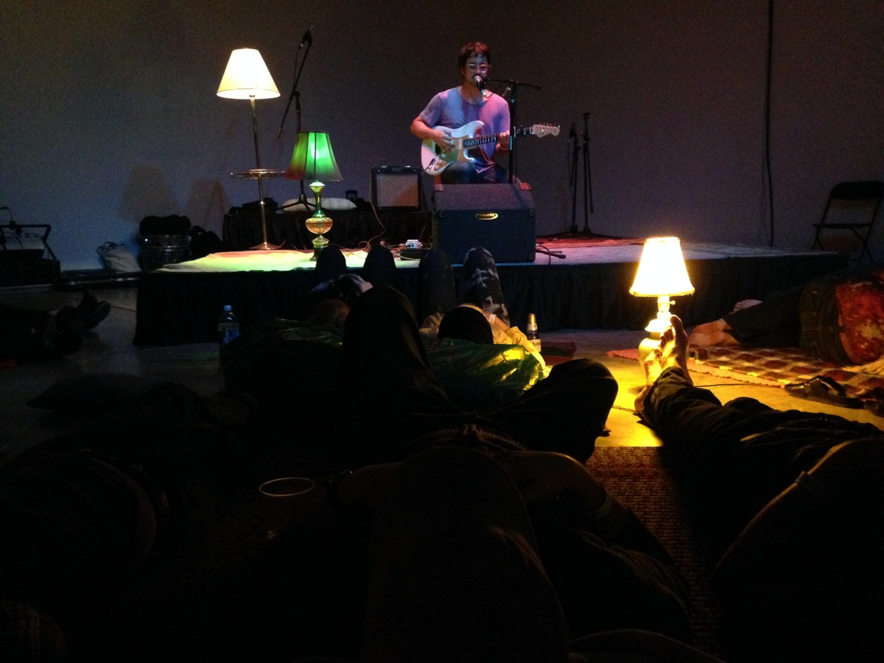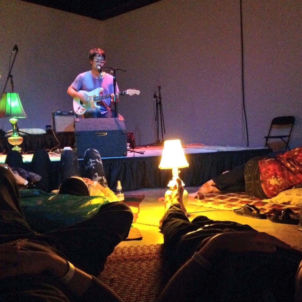 The fourth annual Quiet Music Festival hosted by Disjecta, curated by Chris Johanson, softened hearts and ears last Friday and Saturday (June 27-28). Surrounding a stage only two feet above the concrete floor are layers of pads, blankets and pillows, accommodating an audience of roughly one hundred, which may have swelled up to almost two hundred, on Friday night. Children with hip parents populated the inner circle, because those are the ones who plan ahead.