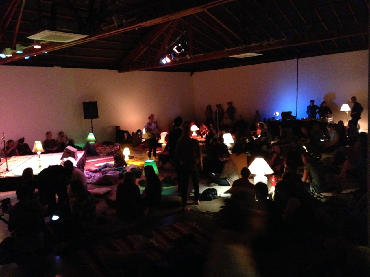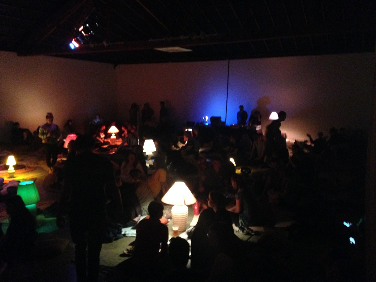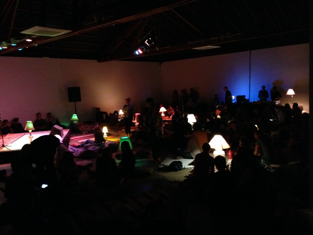The fourth annual Quiet Music Festival hosted by Disjecta, curated by Chris Johanson, softened hearts and ears last Friday and Saturday (June 27-28). Surrounding a stage only two feet above the concrete floor are layers of pads, blankets and pillows, accommodating an audience of roughly one hundred, which may have swelled up to almost two hundred, on Friday night. Children with hip parents populated the inner circle, because those are the ones who plan ahead.